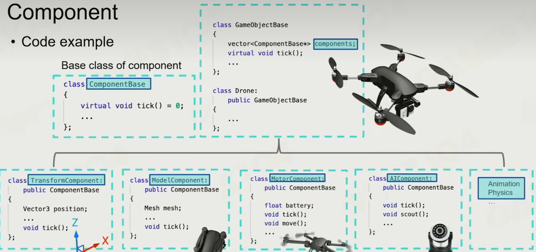 早期引擎大多都是按照这样的方式,使用面向对象的思维,但是面向对象无法解决繁杂交错的派生关系,所以便有了组件化(ComponentBase)